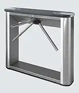 1.) Ein anderer Mechanismus, um Personen einzeln durchzulassen, sind sogenannte Drehsperren mit 3 drehbaren Holmen.