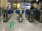 2.) Auch Sperren mit automatisch einschwingenden Hindernissen meist aus Glas, die auch oft mit optischen Sensoren bestückt sind, gehören dazu. Füge hier turnstile=flap_barrier hinzu, ebenfalls ggf. das Bezahlsystem unter payment=*. Oft auch als automatischer Ausgang installiert.
