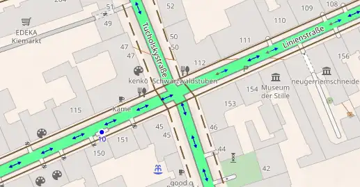 • CyclOSM zeigt Fahrradstraßen mit blauen Pfeilen in beide Richtungen.