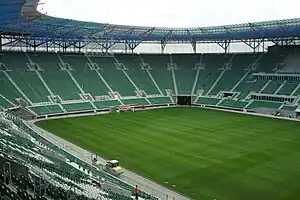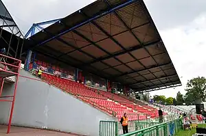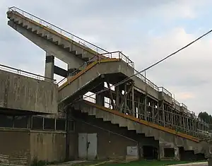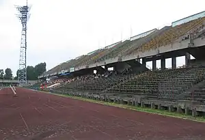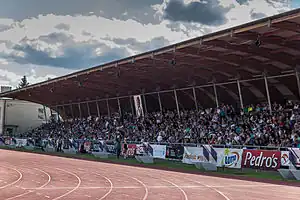 | Die Haupttribüne eines Stadions oder einer Rennbahn. |