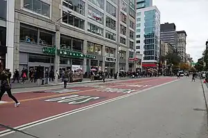 | Also often referred to as a busway, a transit mall is a street, or set of streets, in a city or town along which automobile traffic is prohibited or greatly restricted and only public transit vehicles, bicycles, and pedestrians are permitted.[3]These types of roads may experience high levels of conflict between pedestrian/bike traffic, and bus traffic. | ![]() |