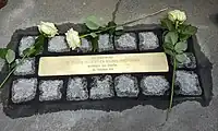 Eine Stolperschwelle ähnelt einem Stolperstein, ist aber breiter (100 mal 10 Zentimeter) und die Messingplatte beschreibt Opfergruppen oder ein Ereignis, bei dem es um Opfer der nationalsozialistischen Vernichtung oder Verfolgung geht.
