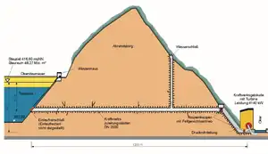 | Ein Wasserschloss fängt den Druckstoß in der Wasserleitung eines Wasserkraftwerks ab, der beim Schließen des Schiebers entsteht. |