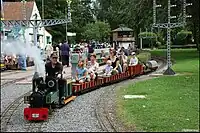 | Eine Eisenbahnstrecke für Miniaturzüge, die in der Regel zur Personenbeförderung geeignet sind. |