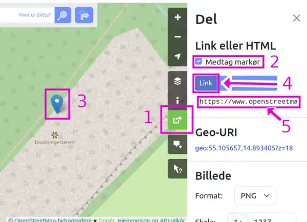 Du kan vise noget på OSM-kortet til andre (dele det) ved at …