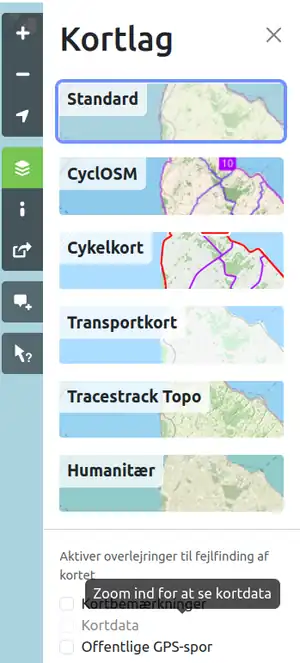 Du kan skifte mellem forskellige "lag", som giver forskellige visninger af de samme kortdata. Gør dette ved at klikke på lag-ikonet (4)