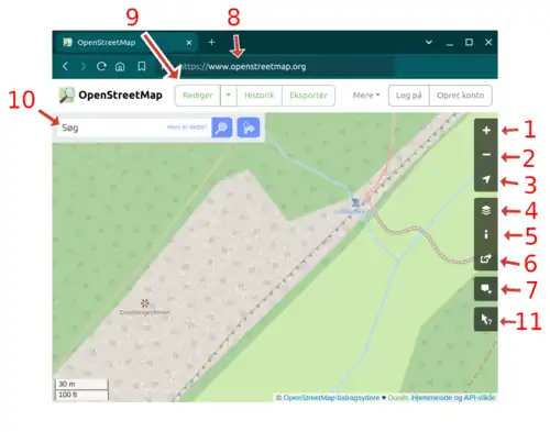 Det følgende angår simpel udforskning af OpenStreetMap på www.openstreetmap.org
