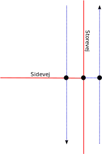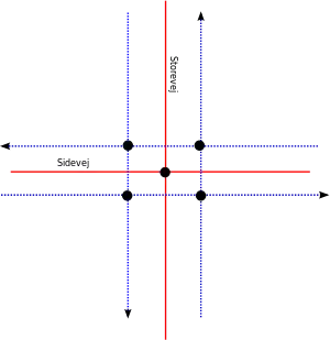 Figur 4 viser den mest simple konfiguration hvor en vej med modsatrettede, ensrettede cykelstier krydses af en mindre vej uden cykelstier. Masser af kryds er tegnet som dette i OSM, men som vi så med T-krydset i Figur 2, afspejler det næppe de givne forhold. Topografien strengt taget kun korrekt såfremt cykelstierne langs Storevej krydser Sidevej i et separat kryds uden forbindelse til selve krydset mellem Storevej og Sidevej.