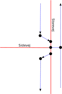 Her er Storevej en tosporet vej, og Sidevej en almindelig vej. Langs begge veje er der ensrettede cykelstier i begge retninger. Endvidere tager vi her højde for den situation der blev beskrevet i afnit (ref), nemlig at cykelstierne i den virkelige verden ikke føres igennem krydset, men at cykeltrafikken ledes ud på bilernes kørebaner. Igen er det vigtigt at afbilde denne situation korrekt, idet disse kryds er farlige for cyklister, fordi cykelstien som regel munder ud i bilernes højresvingsbane.