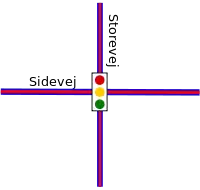 Vi skal nu se på almindelige vejkryds hvor to veje krydser hinanden. Vi starter som før med den mest simple situation, men som man vil se bliver tingene hurtigt komplicerede efterhånden som vi tilføjer flere vejspor og stopsignaler.