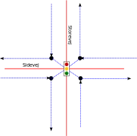 Figur 3 viser et arrangement som ses masser af steder i kortet, i situationer hvor både hovedvejen og den tilstødende vej har tilhørende cykelstier. For at få topologien korrekt hvad angår rutning er der nu lavet to ensrettede forbindelser fra Sidevej til den østlige cykelsti langs Storevej. Det er ikke sikkert at det ser således ud i virkeligheden. Ofte vil der f.ex. være en opkørsel fra vejbanen til cykelstien ca. midt for og over for Sidevej. Topologien afspejler heller ikke det faktum vi så i Figur 2, nemlig at cykelstien fra nord mod syd ikke eksisterer i selve krydset.