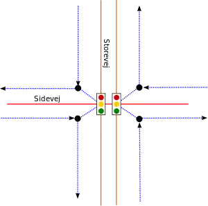 Som det ses skal der 16 knuder (incl. de to stoplys) til at definere et vejkryds af denne type. Konnektiviteten igennem krydset er korrekt, man skal passere et trafiklys uanset hvordan man bevæger sig igennem krydset.