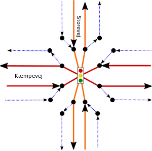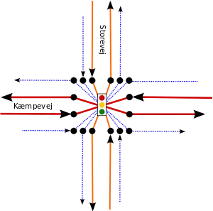 Vi har her et kryds mellem to to-sporede veje, Storevej og Kæmpevej. I alle retninger er der cykelstier, og de er tagget på begge baner af Kæmpevej således: