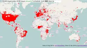 The map is updated minutely with worldwide coverage of all duplicate nodes. This is made possible by some clever OWL-based trickery behind the scenes. Developed by User:Matt, this supersedes the more simplistic display TIGER fixup/250 cities/duplicate nodes. Note that this new map shows all duplicated nodes not only highways duplicated nodes like the previous one. It is important to note that, despite the design of the map, these are not all necessarily errors, and should not all be "fixed" by merging nodes.
