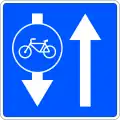 Carril para ciclistas compartido con el carril para autobús/taxi y en sentido opuesto a una carretera de una solo sentido.