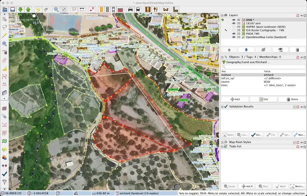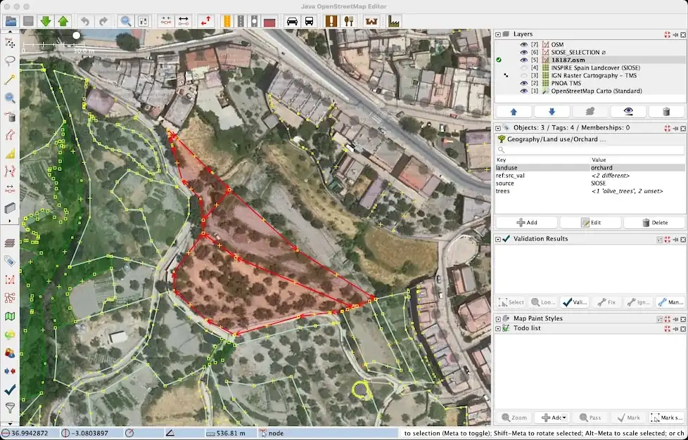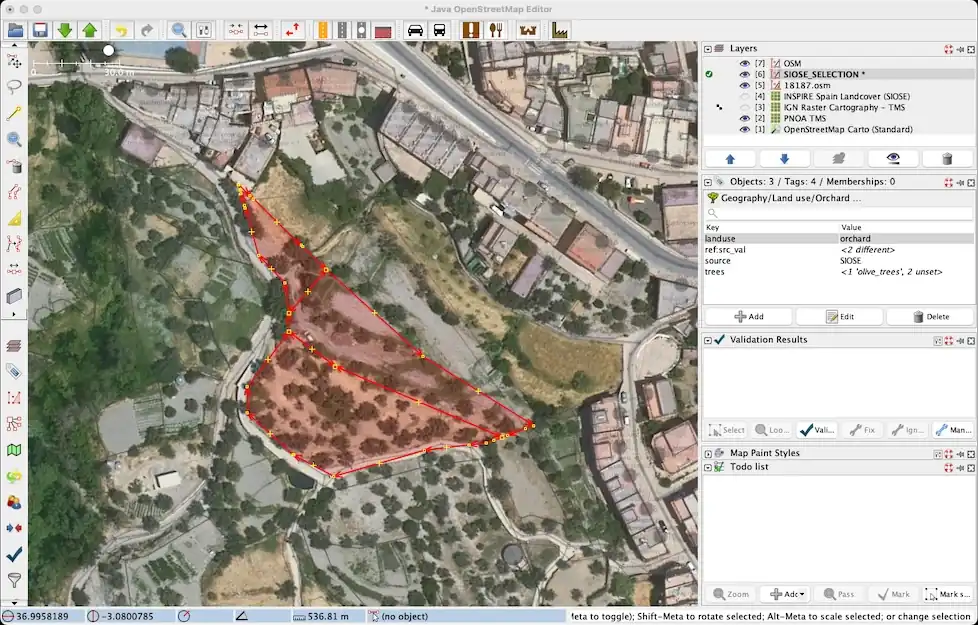 El mayor problema con la importación es la fusión, que tiene que ver con el uso del suelo (landuse) y la cobertura del suelo (landcover) existentes, principalmente de importaciones CORINE. Al igual que con la importación de edificios del Catastro, debemos ir casi polígono por polígono (importación fragmentada) y siempre basándonos en las imágenes aéreas de PNOA, es decir, en lo que se ve en el terreno.