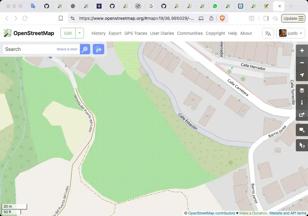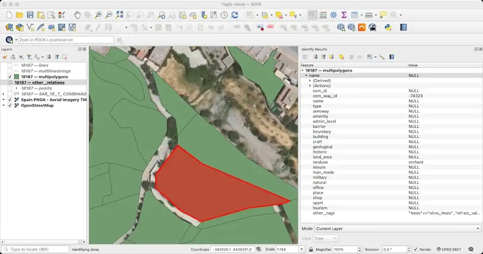 - SELECCIONA: busca en el mapa (OSM Carto) y en las imágenes aéreas PNOA algunos polígonos contiguos, selecciónalos, en este caso 3 polígonos