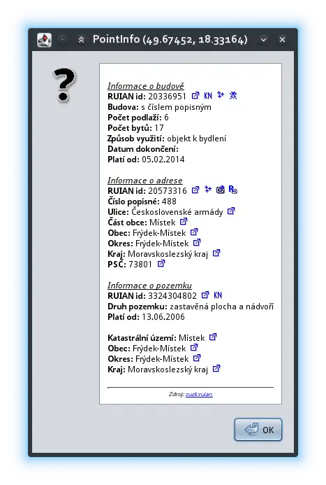 El complemento pointinfo muestra información recuperada de una base externa al hacer clic en un punto del mapa. En este momento sólo están disponibles dos módulos para recuperar información, el RUIAN Checo y los Servicios Web del Catastro español.