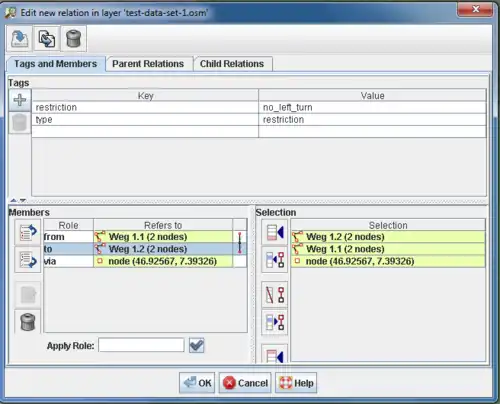 Además, puedes usar el editor genérico de relaciones de JOSM para crear o editar una restricción de giro.