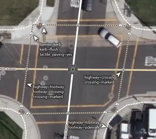 Asimismo, un tramo de vía de un highway=footway se etiqueta con crossing=uncontrolled + crossing_ref=zebra para indicar cuál es la longitud completa del paso peatonal.