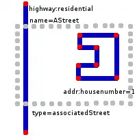 <node id="1" lat=...lon=...> <tag k="addr:housenumber" v="10" /> <tag k="addr:street" v="AStreet" /> </node> <node id="2" lat=... lon=...> <tag k="addr:housenumber" v="20" /> </node> <node id="3" lat=... lon=...> <tag k="addr:housenumber" v="100" /> </node> <way id="11"> <nref id="1"/> <nref id="2"/> <nref id="3"/> <tag k="addr:interpolation" v="even" /> </way> ó <relation id="??"> <tag k="type" v="associatedStreet" /> <member type="way" ref="11" role="house" /> <member type="way" ref="???" role="street" /> </relation>