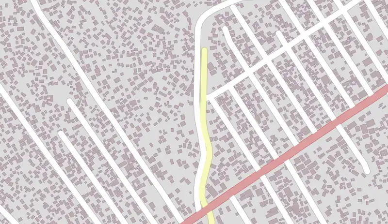 En este ejemplo, la vía primaria y la terciaria están conectadas por una vía sin clasificar. Lo mismo ocurre entre las dos vías terciarias. Tras revisar las imágenes, esta vía merecería ser etiquetada como terciaria. Esto requiere verificar el ancho de las calles para identificar las principales que no deben etiquetarse como residenciales, sino como sin clasificar o incluso terciarias.