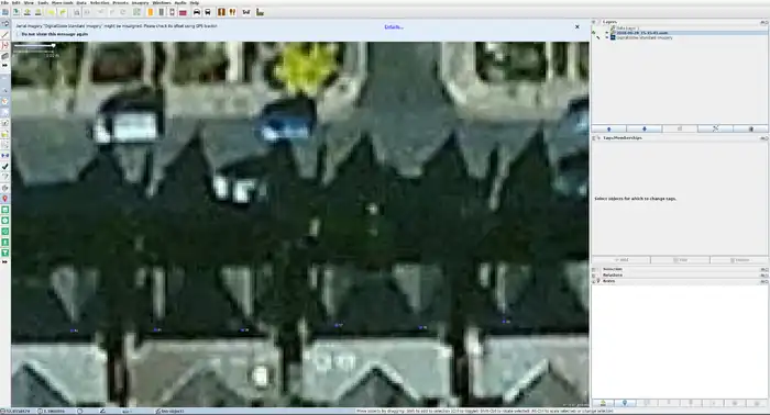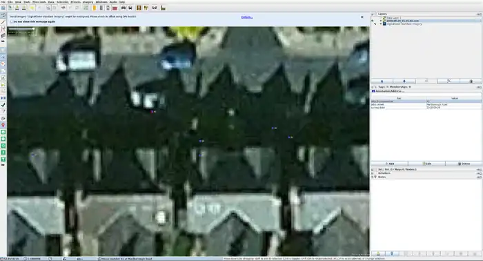 Carga los datos en JOSM (abre JOSM, Ctrl+O, encuentra el archivo osm & gpx). Activa las imágenes y descarga los datos de OpenStreetMap del área que reconociste para verificar si hay algún conflicto (por ejemplo, si las direcciones que recopilaste ya han sido mapeadas.)