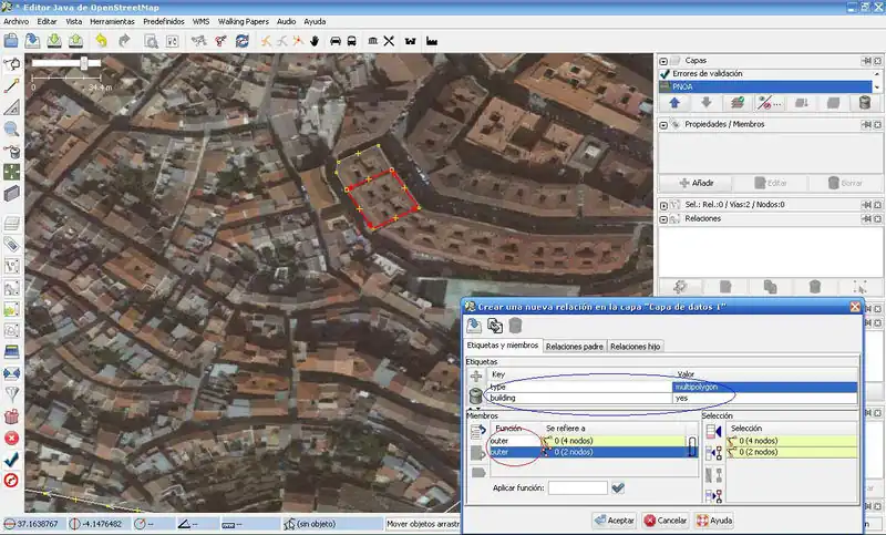 fig.6 Quinta captura de pantalla - Ponemos ambos segmentos de la relación como outer (apartado Función; círculo rojo), y añadimos las etiquetas (elipse azul): type=multipolygon y building=yes. Pulsamos Aceptar.