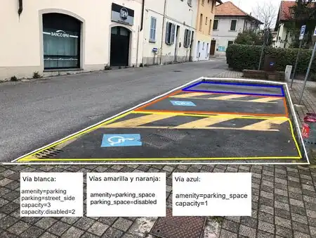 Para una explicación mucho más detallada del nuevo esquema de etiquetado que emplea amenity=parking_space, amenity=parking_entrance y relaciones tipo site, por favor, lee la propuesta. También puedes encontrar información sobre cómo etiquetar restricciones de acceso para cierto tipo de perfiles de usuarios (estacionamiento para padres o familias, estacionamiento para personas con discapacidad).