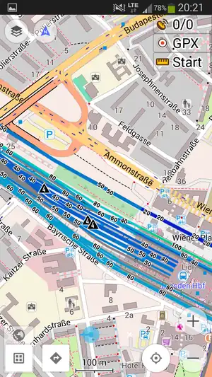 Eine von vielen Anwendungen auf der Basis von OSM-Eisenbahndaten: Eisenbahn- Geschwindigkeitsdaten aus der OSM-Datenbank werden auf eine OsmAnd-Hintergrundkarte gelegt.