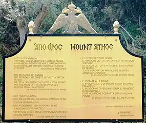 Αν και στο Άγιον Όρος χρησιμοποιούνται οι πινακίδες του ΚΟΚ, (βλ. τις πινακίδες στον δρόμο Δάφνη - Καρυές - Καρακάλλου στο YouTube.), η Ιερά Κοινότητα και η Ιερά Επιστασία έχουν θεσπίσει δικές τους πινακίδες, οι οποίες ισχύουν για συγκεκριμένα ζητήματα της χερσονήσου, ως εξής: