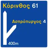 Προειδοποιητική κατευθύνσεως με αναγραφή κατευθύνσεων και χιλιομετρικών αποστάσεων σε οδούς τοπικού οδικού δικτύου. | Βλ. τις γενικές οδηγίες για πινακίδες προορισμού. Επίσης χρησιμοποιείστε το destination:distance=* για τις χιλιομετρικές αποστάσεις μόνο σε ειδικές περιπτώσεις. Γενικά, η απόσταση από τον προορισμό μπορεί να εξαχθεί από δεδομένα OSM και δεν χρειάζεται να επισημανθεί.