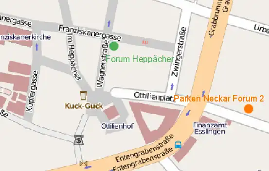 Kneipen-Termine und Mapping-Sitzungen der Esslinger Mapper werden auf der Mailingliste für Stuttgart vereinbart. Für Mapping-Sitzungen sind wir regelmäßig/unregelmäßig im Forum Heppächer (Bürgerzentrum für die Innenstadt, Im Heppächer 23, siehe Karte). Achtung: In der unten stehenden Karte ist das Forum eine Straße zu weit östlich eingezeichnet.