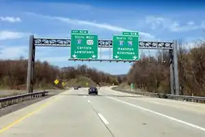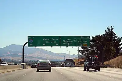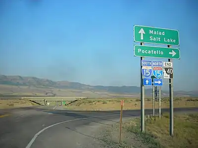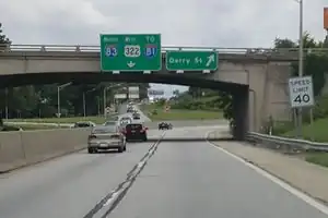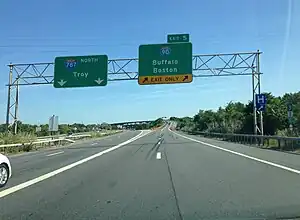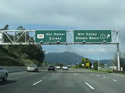 This exit has no visible number signage. Unnumbered exits are common on controlled-access U.S. routes and state highways in many parts of the U.S., as well as on Interstate freeways in California.