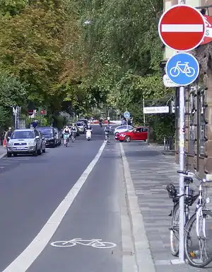 Le double-sens cyclable doit théoriquement obligatoirement être signalé par le panonceau M9v2 (sauf vélo) apposé[1] sous le panneau de sens interdit : sur le terrain donc seule la présence d'un panonceau "Sauf vélo" sous le panneau de sens interdit autorise de fait les cyclistes à rouler à "contre-sens" dans une rue à sens unique.