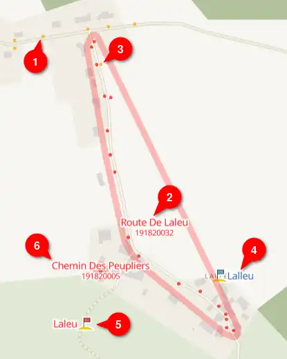 - (4) et (5) Ce lieu-dit en bleu Lalleu est dans OSM mais n'a pas été trouvé dans la BAN. On voit par contre que le lieu-dit Laleu existe dans la BAN avec l'orthographe de la rue, on peut donc corriger le nom dans OSM sans hésitation.