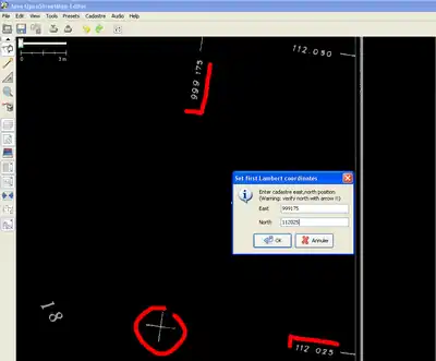 Une fois l'image découpée ou si l'option de découpage est désactivée, le plugin entre dans le vif du sujet en vous demandant d'identifier la position et les coordonnées de deux croisillons de repérage Lambert sur la feuille. Choisissez de préférence des croisillons au bord de la feuille, là où sont visibles les coordonnées Lambert et choisissez-les aussi, si possible, à des extrémités opposées de la feuille. Cliquez de manière très précise sur le milieu du croisillon, c'est extrêmement important pour la qualité de positionnement final ! Puis entrez les coordonnées Lambert correspondant à ce croisillon dans le dialogue apparaissant après le clic. Ces coordonnées correspondent à des distances en mètres et contiennent souvent un séparateur "." pour les milliers. Donc si le plan affiche "99.500", il faut taper "99500". Vous devrez entrer les coordonnées "Est" et "Nord" (East, North) en faisant attention à l'orientation de la feuille que vous lisez. En effet, sur toutes les feuilles figure une flèche indiquant le nord. Habituellement, celle-ci est pointée vers le haut de la feuille. Si c'est le cas, les chiffres en bas et en haut de la feuille sont les coordonnées "Est" et celles qui sont à gauche et à droite sont les coordonnées "Nord". Mais si la flèche indiquant le nord est orientée vers la gauche ou la droite de la feuille, l"Est" et le "Nord" sont bien entendu, orientés en conséquence, c'est-à-dire que les coordonnées "Est" se retrouvent à gauche et à droite, etc.
