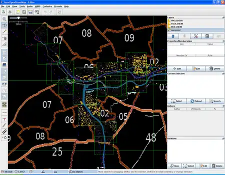 Une fois la feuille sélectionnée, celle-ci sera chargée dans JOSM par petits morceaux pour obtenir une image lisible, même après rotation. Par défaut, la feuille est découpée en 5 x 5 carreaux mais il est possible de changer ce nombre dans le menu des préférences (F12) du plugin (le découpage pouvant aller de 1x1 à 10x10 dans le champ "Raster images grab multiplier"). Plus vous augmentez le nombre de découpages, meilleure est l'image finale mais plus elle sera lourde en mémoire et longue à télécharger. A vous de trouver le meilleur compromis suivant ce qui vous recherchez sur le plan (pour pouvoir lire les numéros des maisons par exemple, un 7x7 est un minimum; alors que pour simplement tracer une rue, un 2x2 est suffisant).