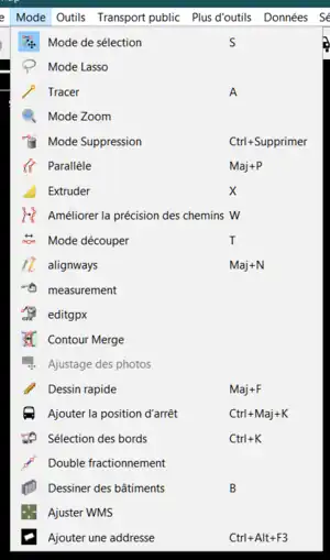 Deux éléments ont été ajoutés au menu Mode de JOSM par le greffon pt_assistant :