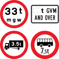maxweightrating:hgv=3.5pourrait être utilisé, mais la signification dehgv=noest identique, et ce second attribut est plus simple — en Pologne, comme dans beaucoup de pays, et à l’inverse de la France, sont des poids lourds les véhicules de transport de marchandises dont le PTRA dépasse 3,5 tonnes. - ↑ Panneau interdisant les véhicules conçus pour le transport de marchandises, ou transportant effectivement des marchandises. Accessoirement, un panonceau peut être présent pour interdire les véhicules dont le PTRA dépasse le poids indiqué sur le panneau. Dans ce cas, utilisez