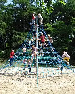 Plan d'escalade incliné, souvent équipé de poignées ou de cordes et faisant souvent partie d'une structure permettant d'atteindre un niveau plus élevé. | ![]() | |||