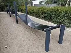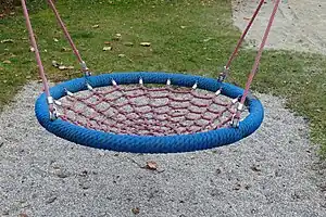 Une balançoire où un élément oscillant (une corde, un tronc, etc.) est accroché à des cordes, et qui permet à plusieurs enfants de se balancer en même temps. | ![]() | |||
