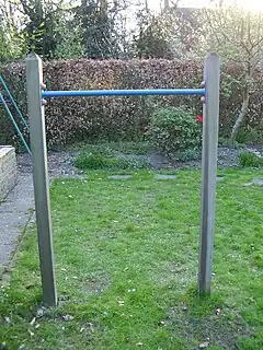 Barres suspendues, auxquelles on peut se suspendre par les mains et se déplacer d'une barre à l'autre. Voir aussi fitness_station=horizontal_ladder.