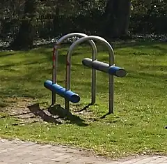 Deux ou plusieurs barres côte à côte destinées à effectuer des mouvements semblables à ceux de la gymnastique. For parallel bars that are part of a distinct leisure=fitness_station, see fitness_station=parallel_bars. If the bars are inclined and therefore intended for sliding moves, use playground=bannister_bars. For vertical bars, playground=climbing_pole may be more appropriate.