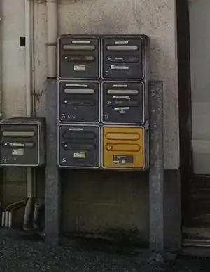 community Les boîtes aux lettres communautaires contiennent des boîtes aux lettres individuelles, ainsi qu'une fente pour le courrier à envoyer.