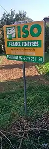 Un pannonceau publicitaire, supporté par un piquet (non pas scellé au sol, mais simplement planté). |