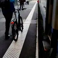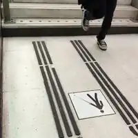 highway=bus_stopet ayant une bande podotactile, il convient d'ajoutertactile_paving=yesau nœud. - changement de niveau: un escalier peut avoir une bande d'éveil à la vigilance avant les marches, à chaque étage il est également possible de matérialiser la bande située devant l'ascenseur (