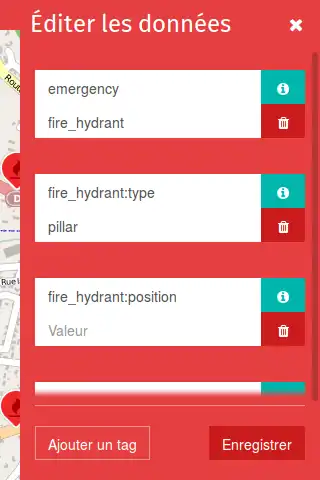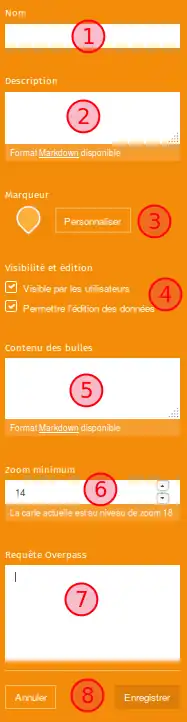 | Permet de consulter les informations définies par le "propriétaire" du thème | Permet de modifier les données, (bientôt déplacer les points) et d'ajouter de nouveaux points | Permet de configurer le thème, la requête overpass, les nœuds prédéfinis, la couleur, le contenu des fenêtres pop-ups, l'icône, ... |