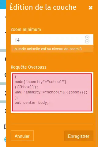 - afficher sous forme de points d’intérêts (POI) des nœuds et chemins (node et way) issus d'OpenStreetMap faisant référence à un tag clé=valeur (key=value) -> nous utiliserons ici : amenity=school