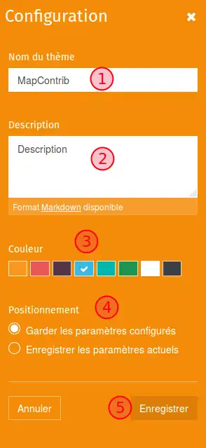MapContrib permet de générer un thème. Le "propriétaire" va ainsi définir le thème par son nom, sa description, sa couleur, le lien et le zoom par défaut où il s'ouvre, par les couches qui le composent, par les fonds de cartes qui sont mis à disposition des contributeurs, par les points d'intérêts (nœuds) prédéfinis. Ce thème sera ensuite mis à disposition via une adresse internet. Tout contributeur OpenStreetMap pourra y accéder pour modifier et ajouter des informations selon la thématique définie par le propriétaire du thème.